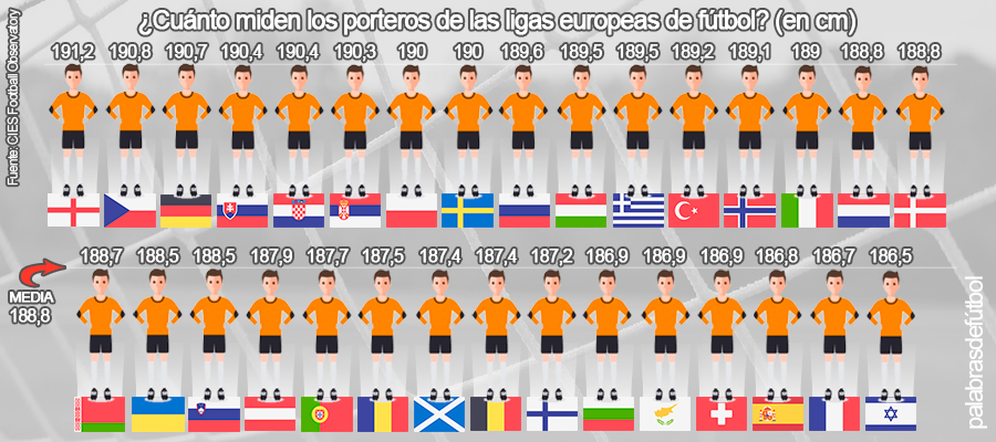 Según el mismo estudio de 2016, los cancerberos españoles eran más bajos, midiendo 186,8 centímetros, dos centímetros por debajo de la media europea. Solo en Francia e Israel la altura de los guardavallas era inferior en aquel momento.